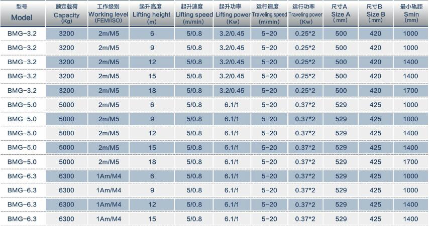 歐式鋼絲繩電動(dòng)葫蘆參數(shù)表: